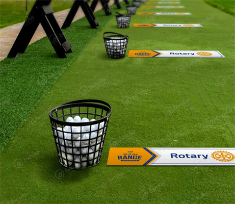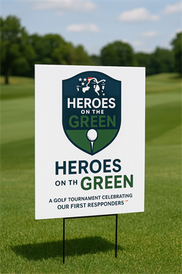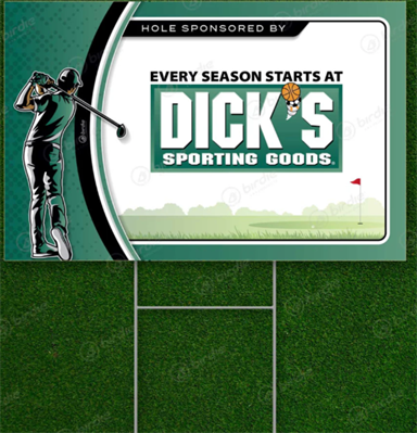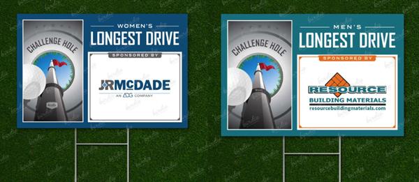 Our standard tee box signs are printed single-sided, full-color on 4mm Coroplast and include wire H-type mounting stakes. Sponsorship includes one (1) full-color tee box sign on a dedicated hole.
